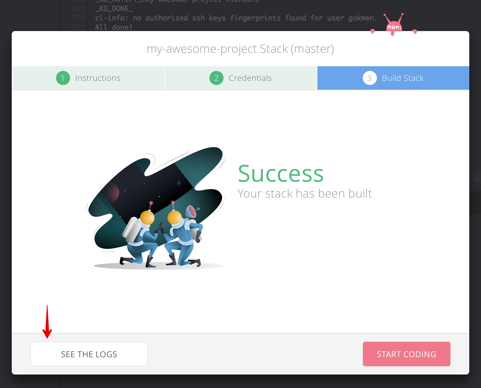 This will open Koding defined in the settings in a new window and will start importing the project's stack file.
