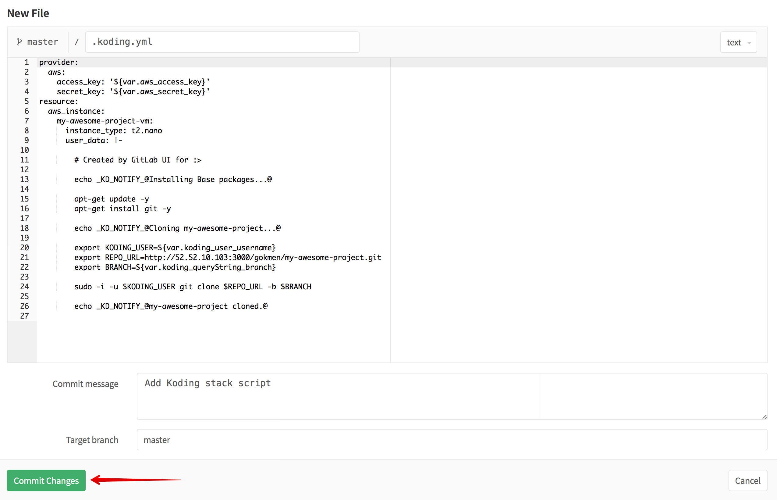 Once you click this will open a New File page on GitLab with auto-generated .koding.yml content based on your server and repository configuration.