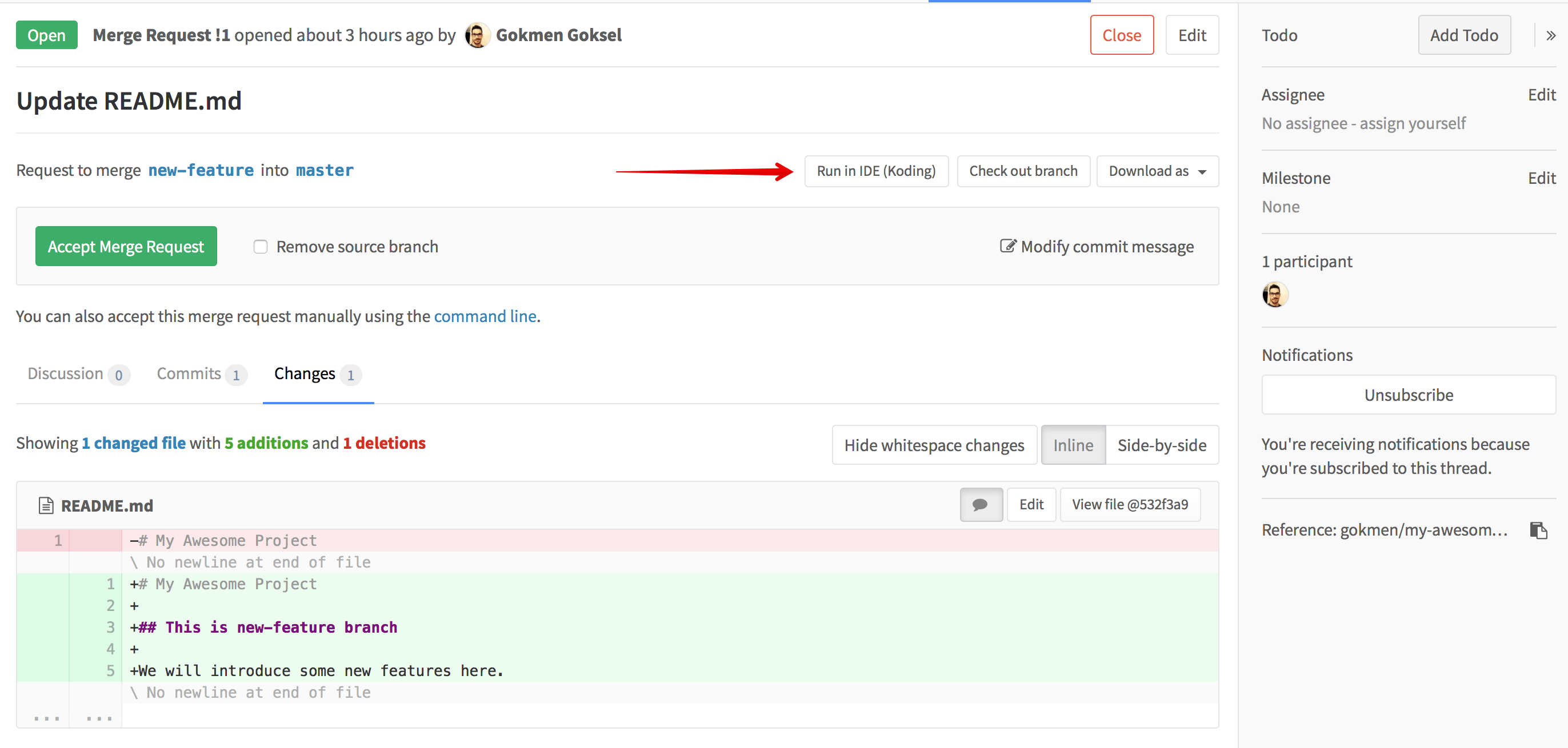 It's also possible to try a change on IDE before merging it. This flow only enabled if the target project has .koding.yml in it's target branch. You should see the alternative version of Run in IDE (Koding) button in merge request pages as well;