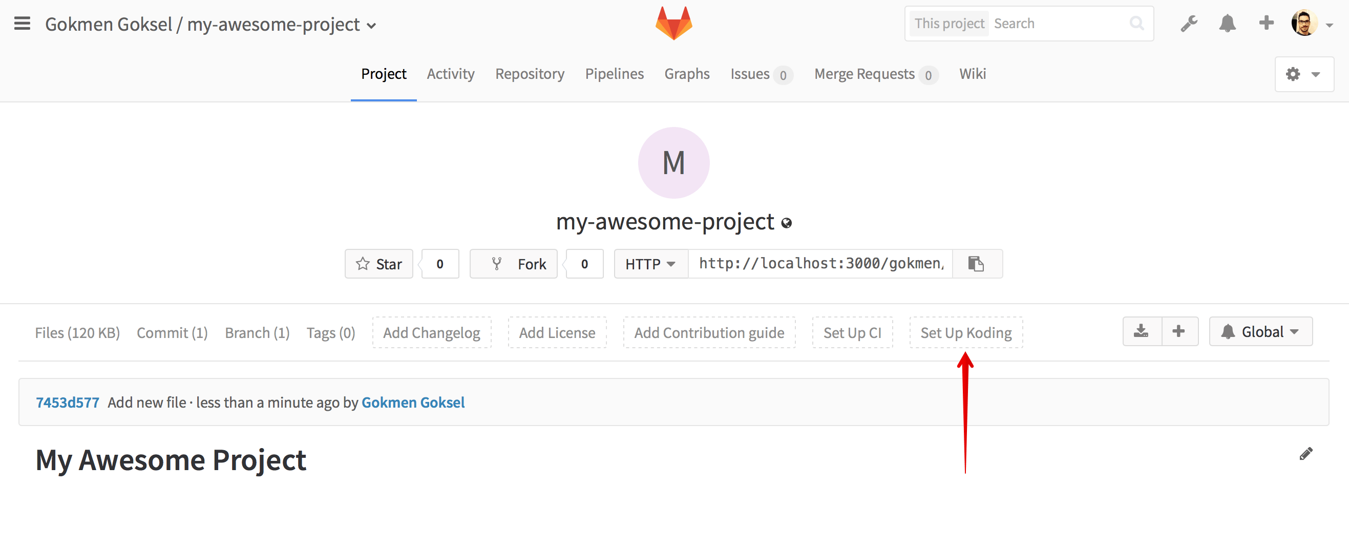 Once it's enabled, you will see some integration buttons on Project pages, Merge Requests etc. To get started working on a specific project you first need to create a .koding.yml file under your project root. You can easily do that by using Set Up Koding button which will be visible on every project's landing page;