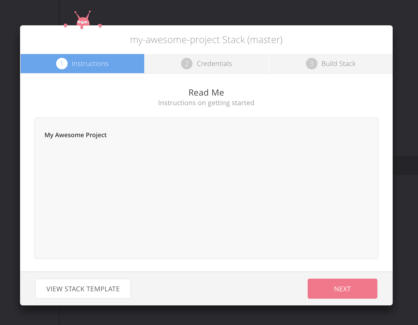 Once stack initialized you will see the README.md content from your project in Stack Build wizard, this wizard will let you build the stack and import your project into it. Once it's completed it will automatically open the related vm instead of importing from scratch.